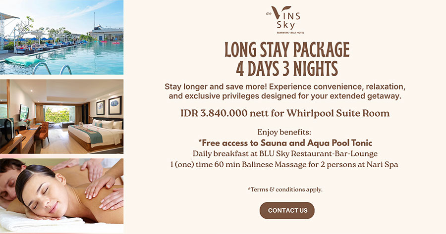 Situated in Jalan Petitenget, one of Seminyak’s key thoroughfares and within only 5 minutes walk to all the famous restaurants, boutiques, galleries, cafe, and nightlife that line this upscale resort area de Vins Sky Seminyak Hotel is only 40 minutes from Ngurah Rai International Airport, 5 minutes away from Petitenget Beach, and 15 minutes away from Seminyak Beach.